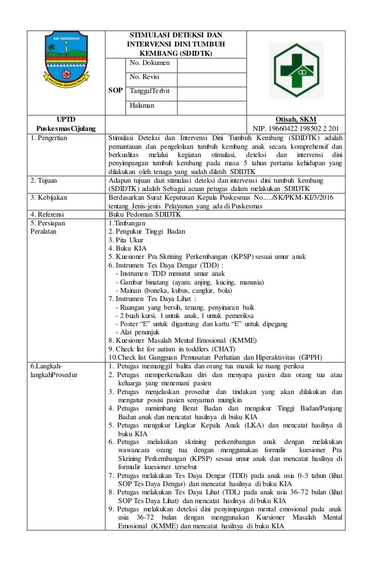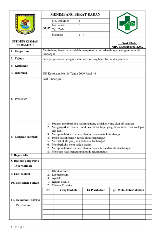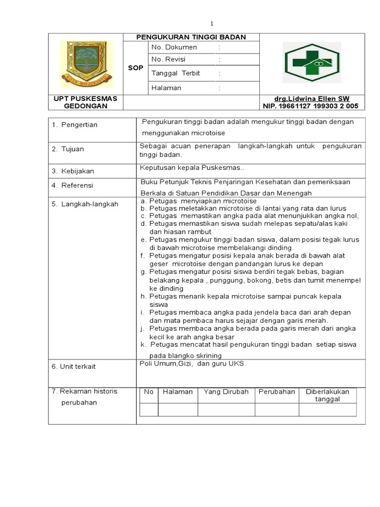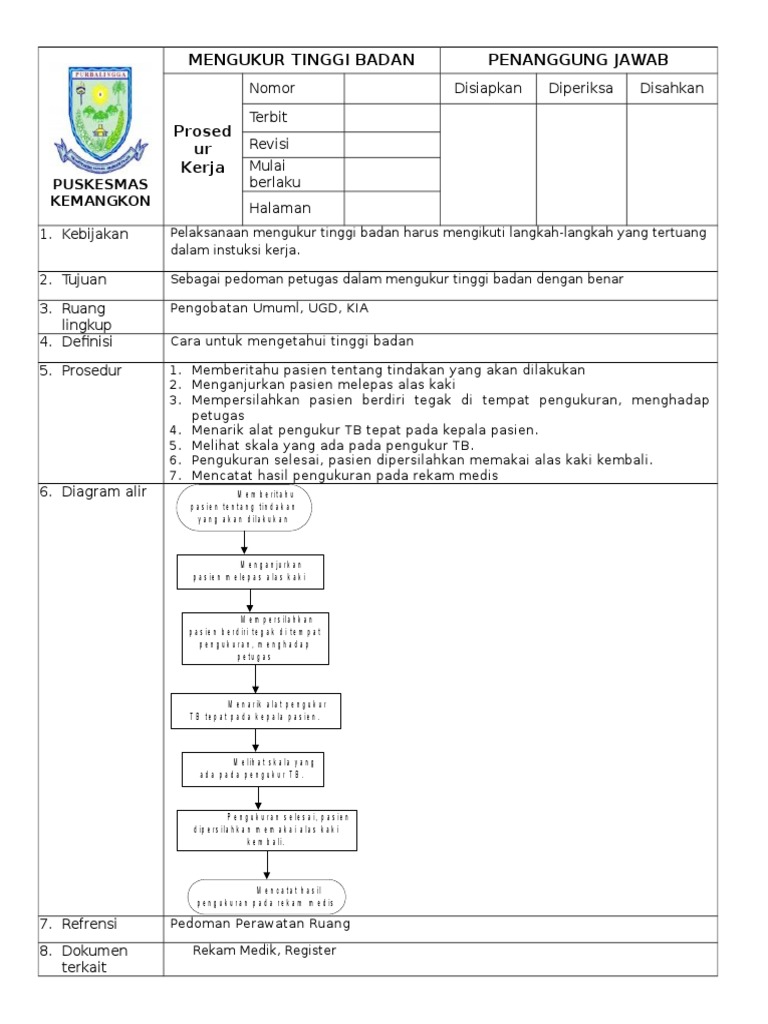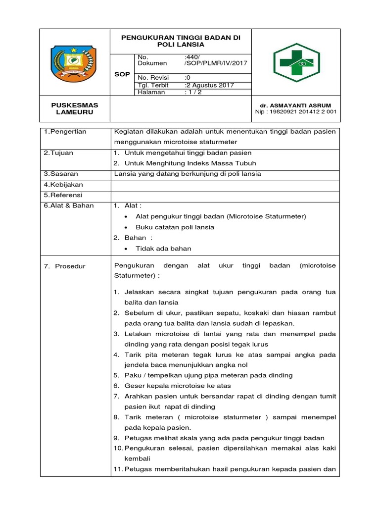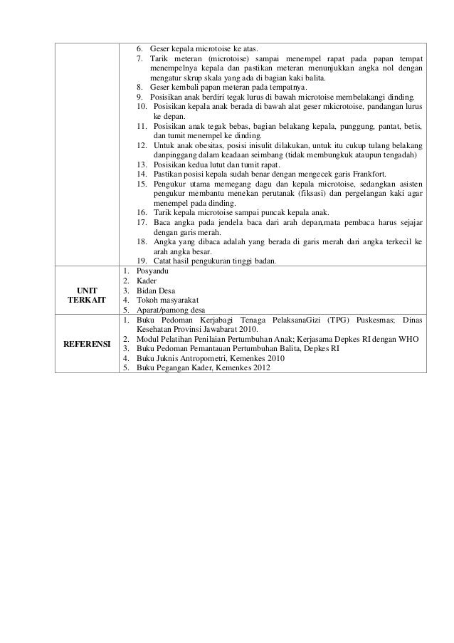 Gerakkan microtoise sampai menempel di kepala anak dan baca angka pada jendela 1. Antropometri yang menggambarkan keadan pertumbuhan skeletal/tulang tujuan :untuk menilai pertumbuhan anak melalui perbandingan tinggi badan berdasarkan usia Alat pengukur tb tidak tegak lurus 2. Tahap kerja melakukan observasi keseluruhan tubuh bayi, postur, ekstremitas termasuk kondisi kulit,warna kulit, adanya kelainan pada kulit, pergerakan bayi, tanda lahir, verniks. Sop mengeluarkan feses secara manual; Revisi tanggal terbit disahkan oleh kepala puskesmas: Simpan simpan sop mengukur tinggi badan untuk nanti 77% 77% menganggap dokumen ini bermanfaat, tandai dokumen ini sebagai bermanfaat 23% 23% menganggap dokumen ini tidak bermanfaat, tandai dokumen ini sebagai tidak bermanfaat Sop pengukuran berat badan puskesmas sepatan pengertian suatu tindakan pada pasien untuk mengukur berat badan dengan menggunakan alat pengukur timbangan badan. Scribd es red social de lectura y publicación más importante del mundo. Search sop mengukur berat badan dan tinggi badan docx timbangan berat badan sekaligus tinggi badan tbk 01 perhitungan berat badan ideal rumus brocha berat badan bisa prediksi risiko penyakit seseorang halaman tabel berat badan janin ibu hamil minggu ke minggu cara. Memastikan timbangan badan berfungsi dengan baik dengan cara mengatur penunjuk angka tepat diangka nol. 301 moved the document has moved here. Sop mengukur tinggi badan / panjang badan pada bayi / anak nomor dokumen :